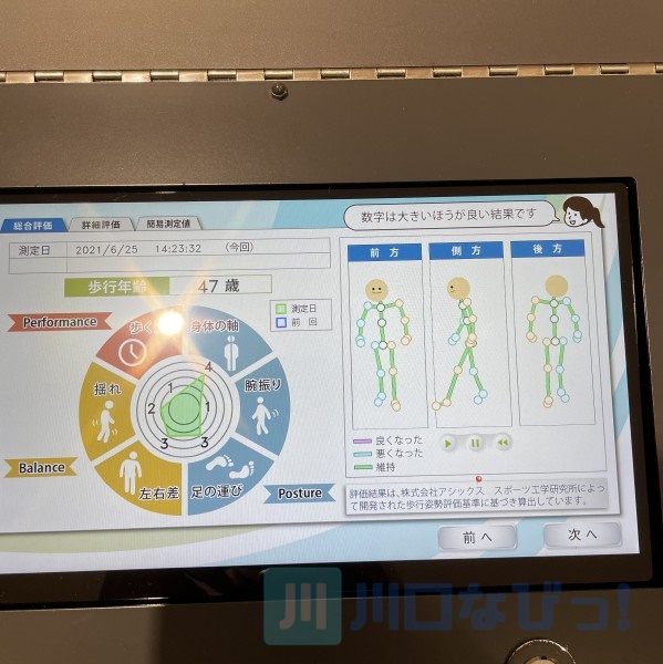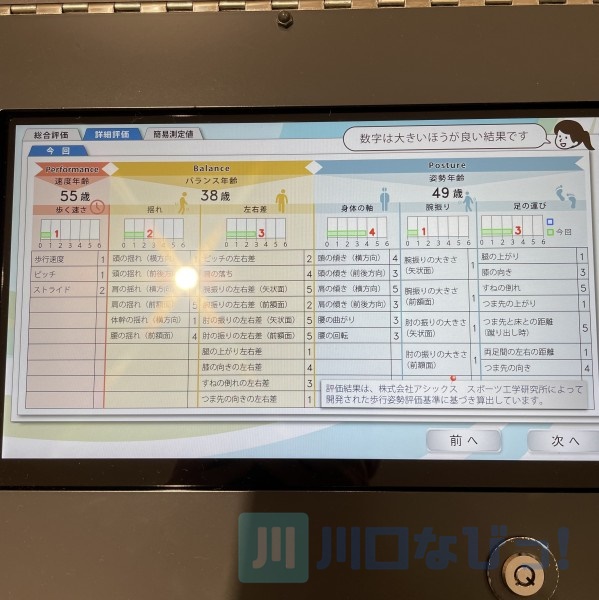 詳細な結果が表示され、バランス年齢や自分の歩き方の良い点、悪い点がわかります。