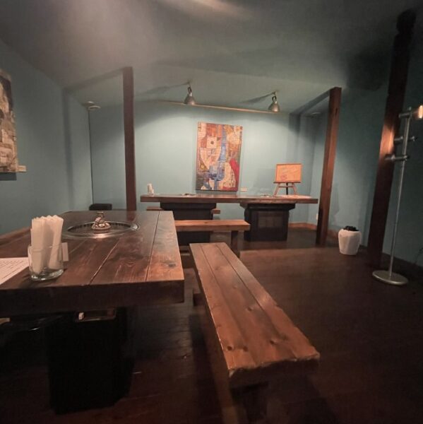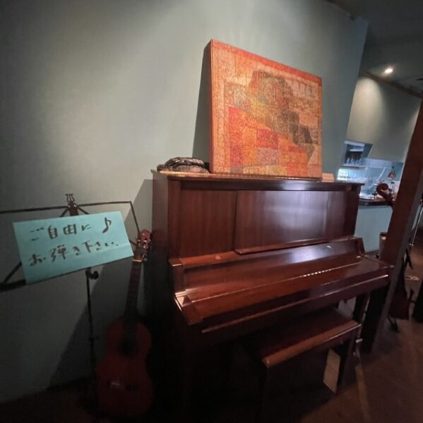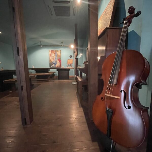 青い壁には何点もの絵画が飾られ、テーブル席以外にピアノやコントラバスなどの楽器も飾られており「ご自由にどうぞ」。