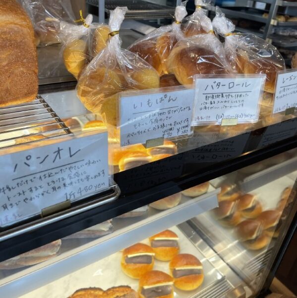 店内ではショーケース内に冷蔵パンが数点あり、惣菜パン等は販売台に一列に並んでいました。