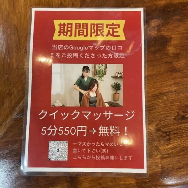 Googleマップに口コミ投稿するとクイックマッサージが5分無料