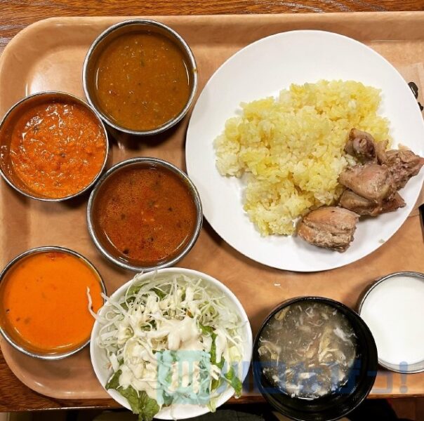 バイキング形式になっていて、カレー4種、ウコンライス、ナン、サラダ(ドレッシング3種)、本日のタンドリーチキン、スープ、自家製ヨーグルトというラインナップ。