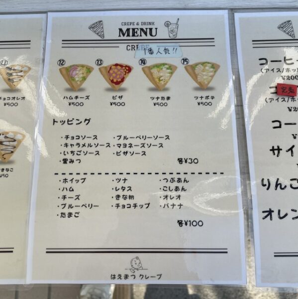 待ってる間にメニューなどに目をやりますが、ハムチーズやツナたまなどのお惣菜系も!!僕お惣菜クレープすんげー好きなんですよ!!