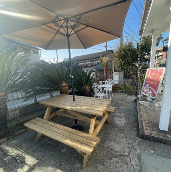 お店の前にはテラス席があるのでそこで食べて行くこともできるよ〜。