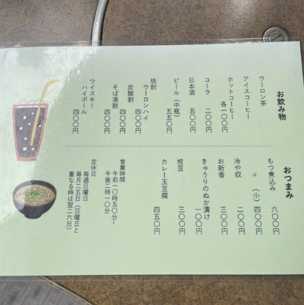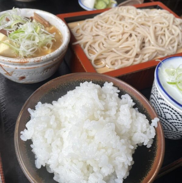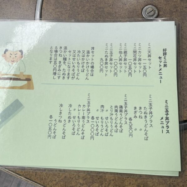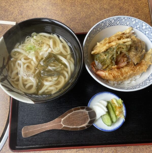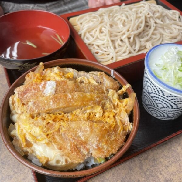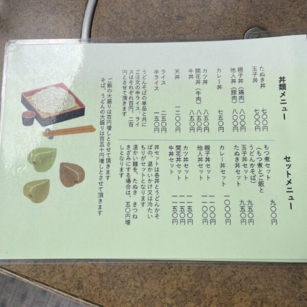カレー鍋うどん(もち追加)、天丼&関西風うどん、かつ丼&ざるそば、モツ煮&ざるそば。