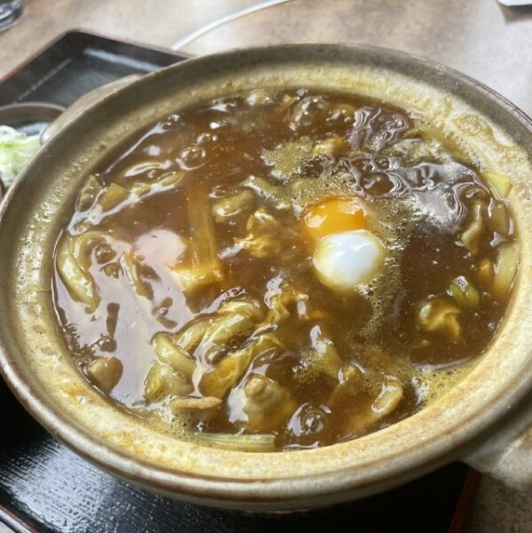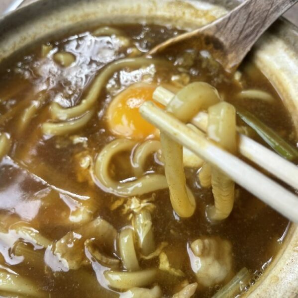 カレー鍋うどんって初めて見たけど、グッツグツに煮えたお鍋で登場!