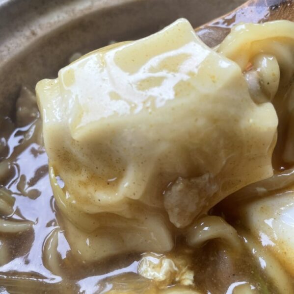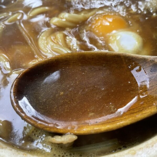 カレー汁は辛さ控えめで子供に食べやすく、熱々とろみが麺に絡みつき旨い!