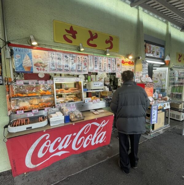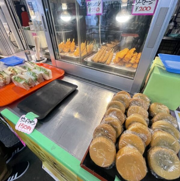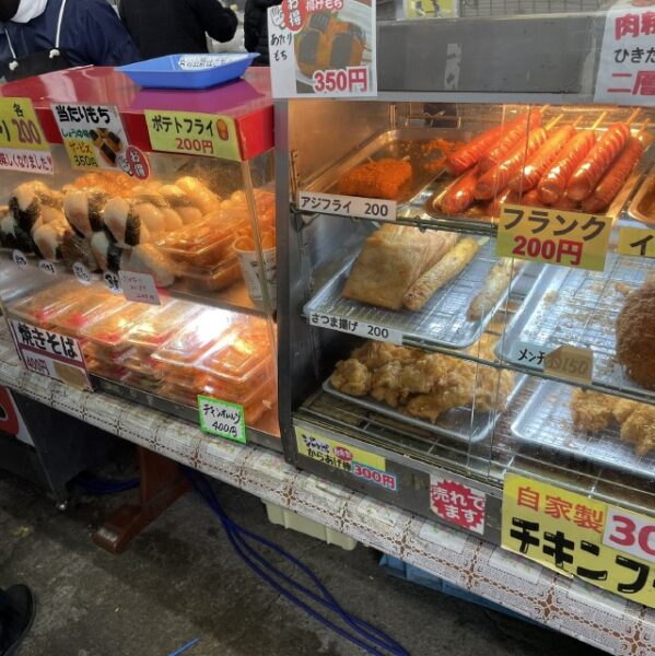 売店ではおにぎり、サンドイッチ、揚げ物、大判焼きなどお祭りなどでも人気の露店フードやモツ煮、豚汁ラーメンなど冬にはありがたい温かい食べ物などよりどりみどり。