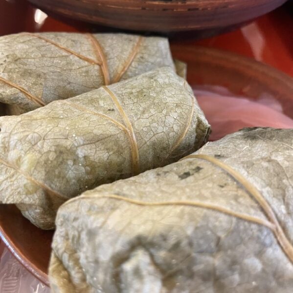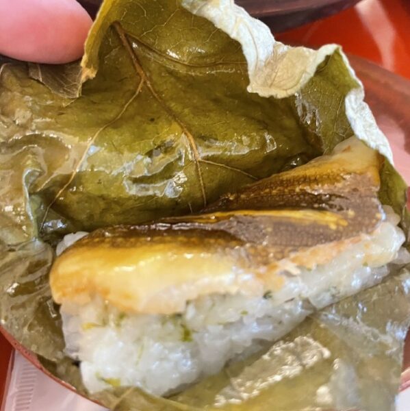 サバの切り身と酢飯を柿の葉で包んだ押し寿司