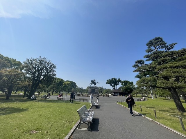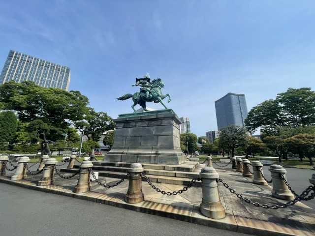 皇居外苑のシンボルである、黒松林と広大な緑の芝生の中にそびえる楠木正成の騎馬像