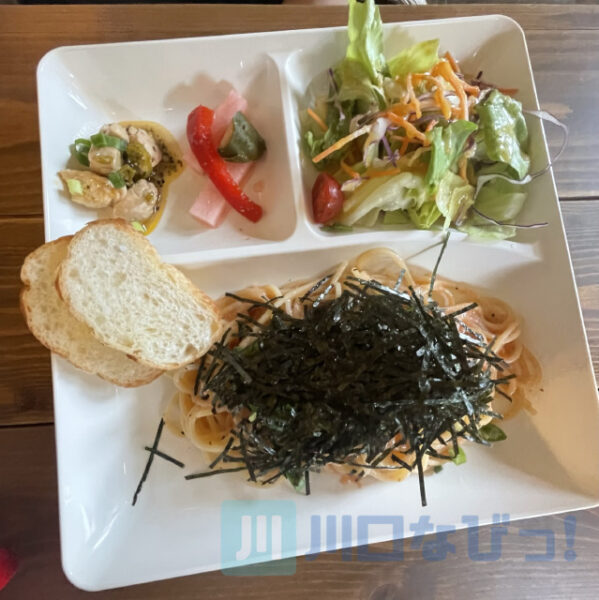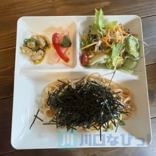 嫁さんは明太子と海苔のパスタ、僕はベーコンと豆乳のパスタにしましたが、どちらも具材たっぷり!