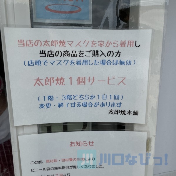 太郎焼マスクをご自宅から着用して商品を購入された方に太郎焼1個サービス
