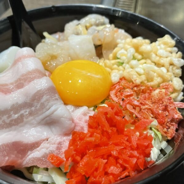 お好み焼きにももんじゃ焼きにもこのTEPPANミックスがあり、具材が肉、海鮮の両方を楽しめるオススメの一品。