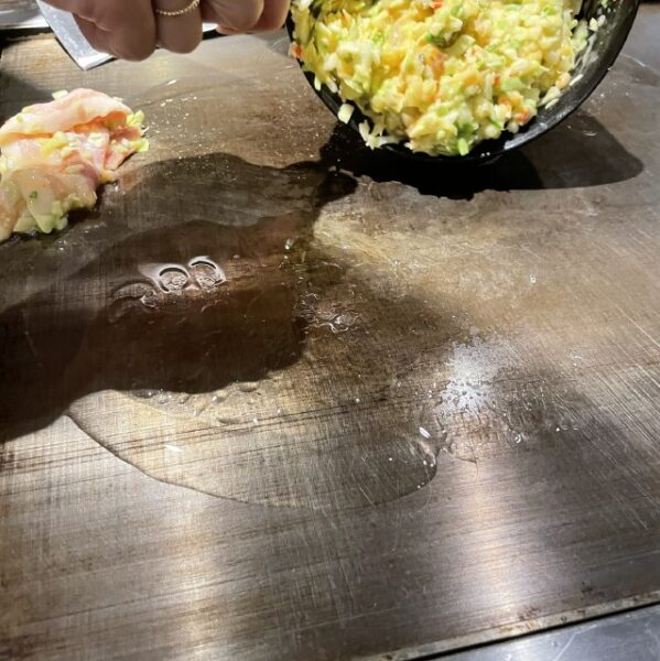 テーブル席に油があるのでそれを鉄板に敷いて、タネをよく混ぜ混ぜしてそこに投入!!