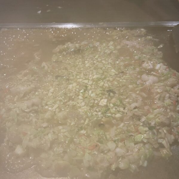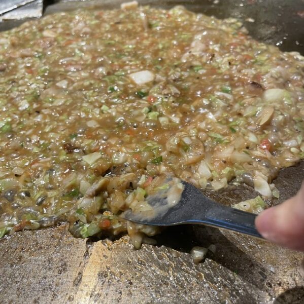 先ずは具材だけを鉄板でよーく炒めて土手を作ります!
