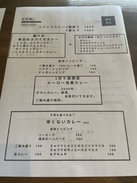 トッピングなどでカスタマイズも可能で1日5食限定のルーロー角煮カレーやお子様向けの辛くないカレーなどもありました。